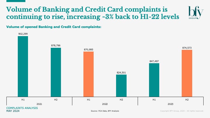 Banks and credit card issuers have seen complaints increase by 50k (6%) in the past year, and a closer look at the H2-23 data shows a 15k (8%) uplift in credit card complaints from H1, with overdraft complaints also rising by 6k (62%).