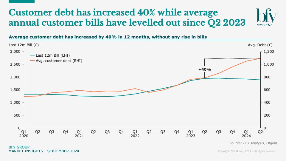 - Energy debt has continued to increase by 40% since Q2 2023 while average annualised customer bills have levelled out