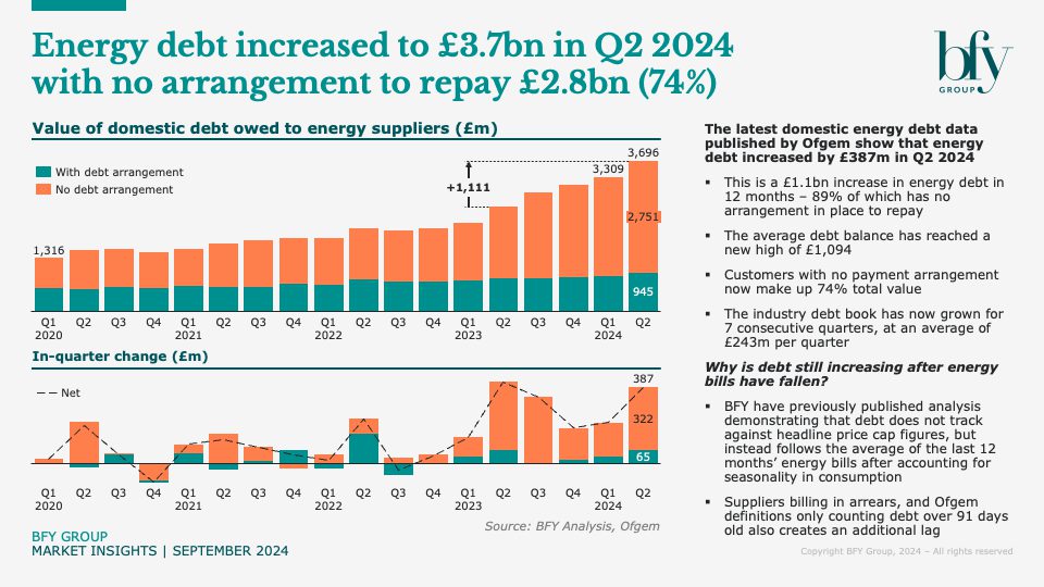 Energy debt grew to £3.7 billion as of Q2 2024, a jump of £387 million on the previous quarter. This is the 7th consecutive increase, averaging £243 million per quarter.