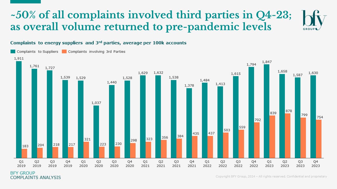 Looking at the overall long-term trend, complaints volumes are starting to return to pre-pandemic levels (Q4-23 was 6% higher than Q4-19), and although this will be welcome news for suppliers, it’s concerning to see a protracted increase in complaints requiring third party support.