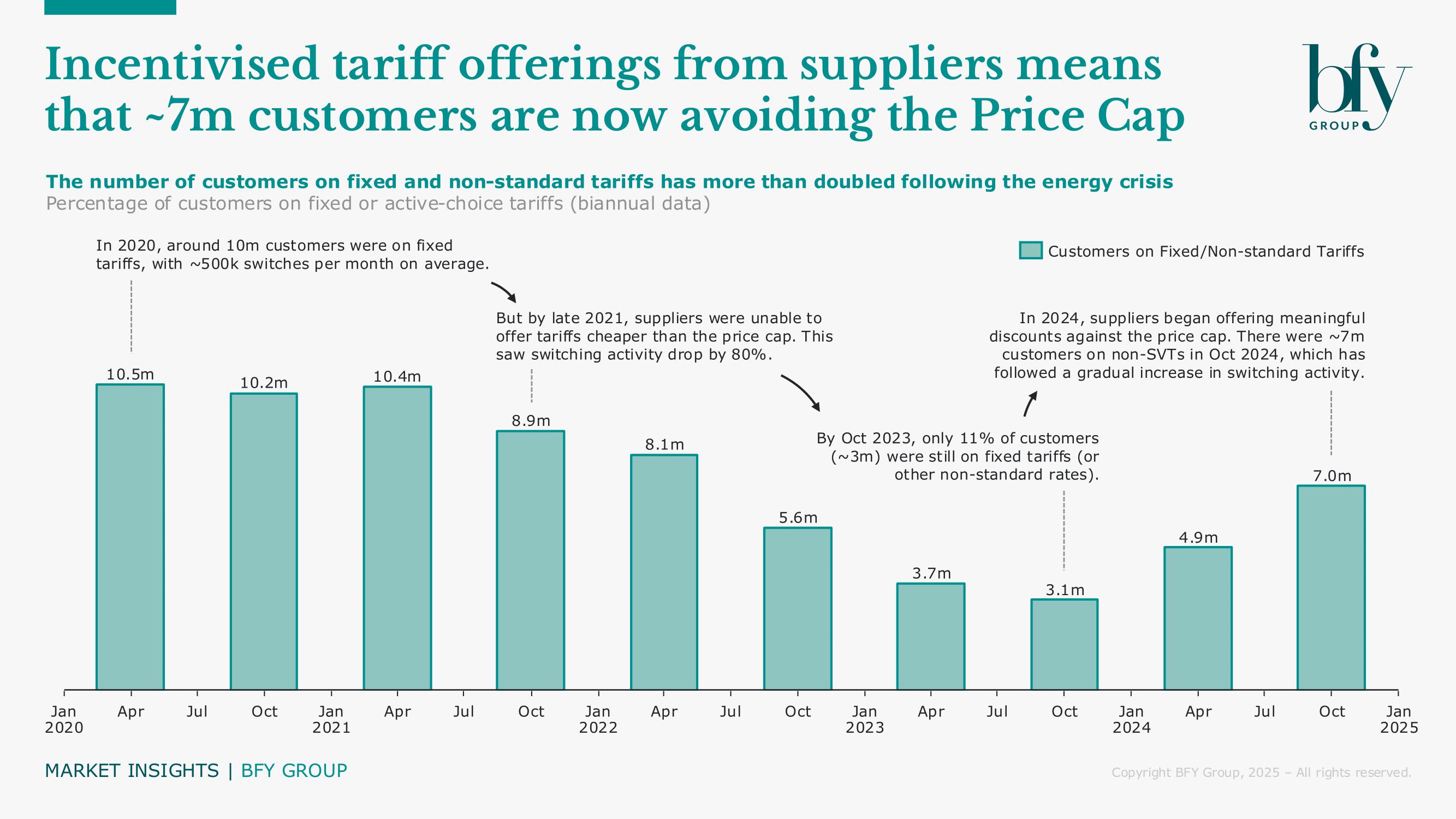 - In 2024, suppliers began offering meaningful discounts against the cap, with ~7m customers on non-SVTs by Oct-24, marking a steady return of switching activity