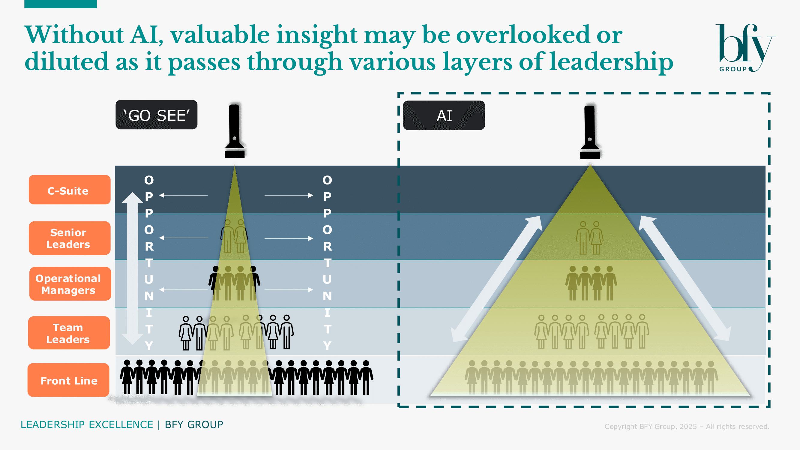 Without full visibility, hidden issues can escalate, leadership conversations can become misaligned with operational goals, and ineffective behaviours can go unchecked. Staying informed through AI is essential to maintaining strategic momentum, empowering leaders, and enabling long-term, sustainable success.