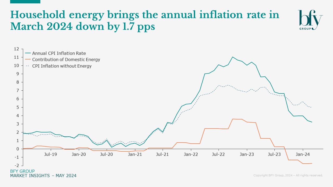 That was back then, so what about now? When looking at the impact of energy costs on the inflation rate to March 2024 of 3.2%, household energy makes a negative contribution due to falling prices. The CPI rate would be closer to 5%, if not for this fall in energy prices.