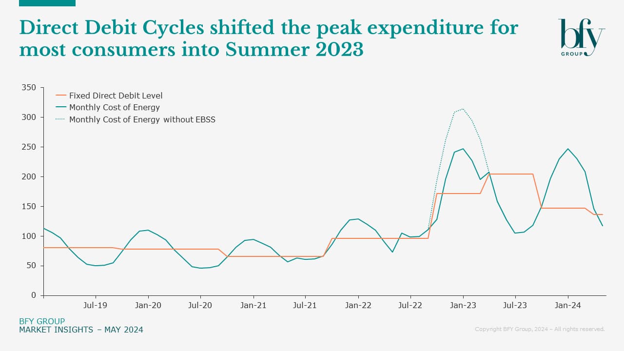 If we assume DD levels are reviewed every six months (Apr/Oct), and are set to recover any deficit built up in the delayed update, then consumers on DD would have spent the most on energy during Summer 2023, spreading the impact of seasonal demand and higher costs over a broader period. This also caused an adverse position where consumers on DD would have seen increasing payments, just as headlines talked to falling energy bills and the easing of the energy crisis.