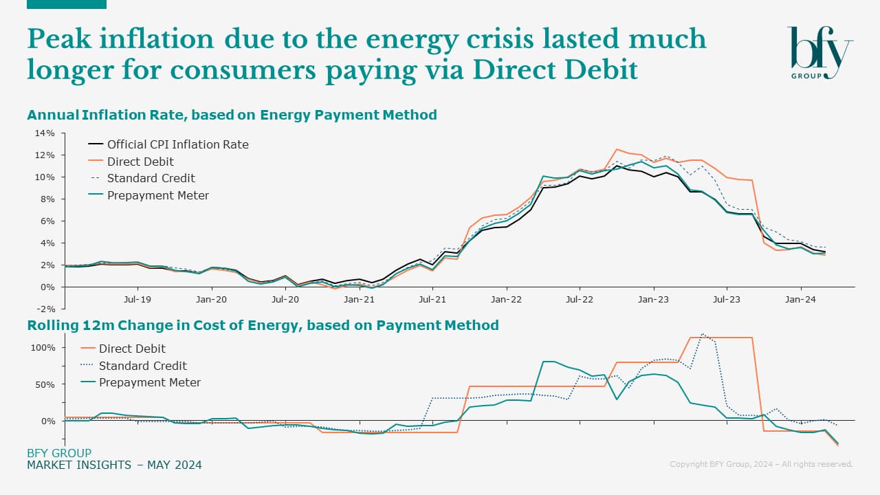 Most consumers on DD are only now in 2024 feeling respite from energy prices, yet they’re still paying double what they paid in 2021. This highlights the different experiences faced by consumers using different payment methods, with those on DD and POROB experiencing more inflation, later than those on Pre-Payment.