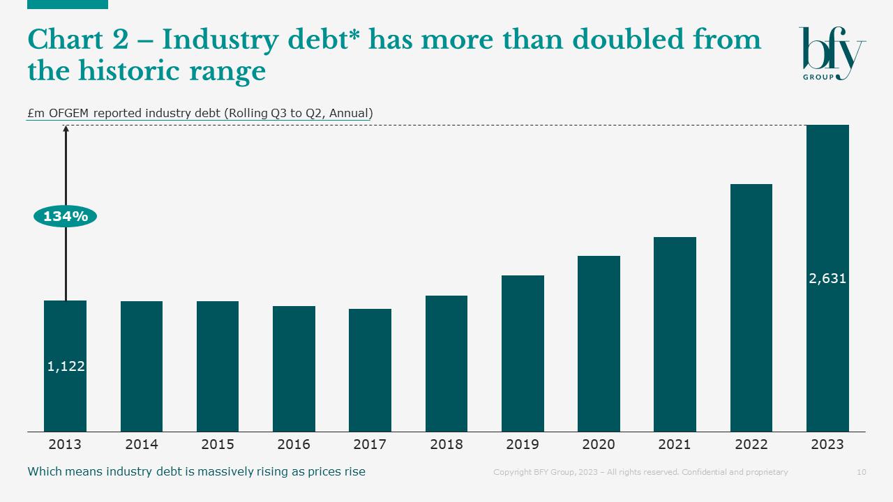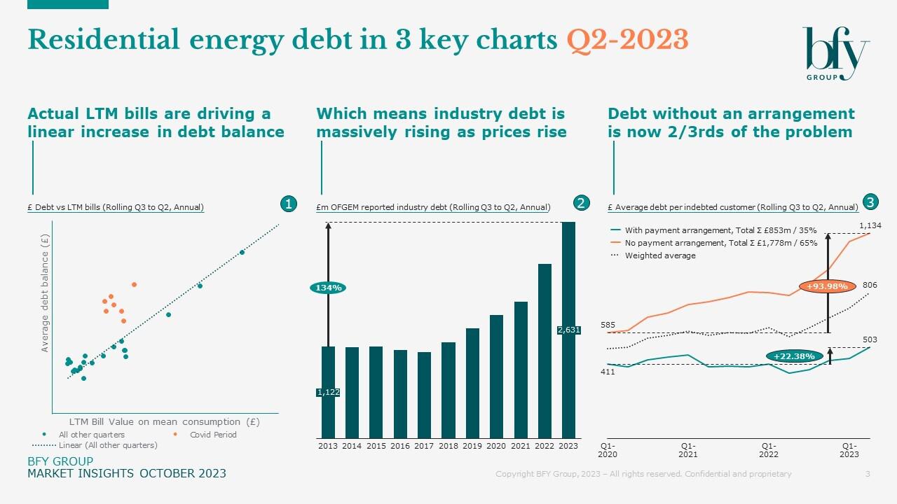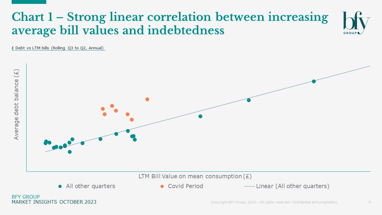 Customer debt levels are rising in line with LTM bills – Chart 1 shows a linear correlation with levels of customer indebtedness and LTM bills, after adjusting for the COVID-19 periods.