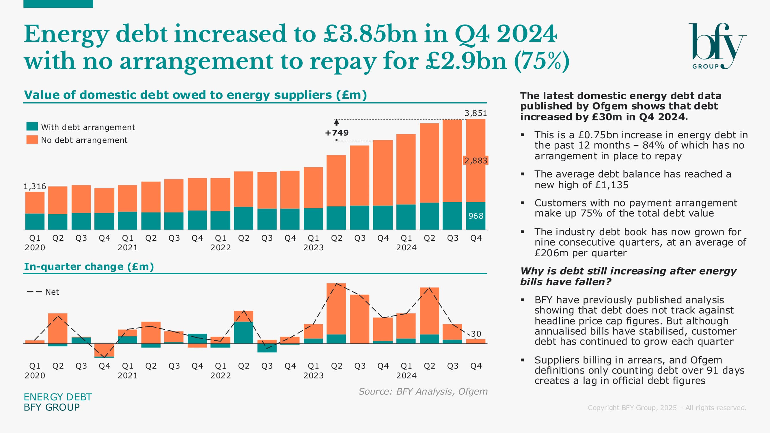 Domestic energy debt hit a record £3.85bn in Q4 2024, rising by £0.75bn over the past year.
