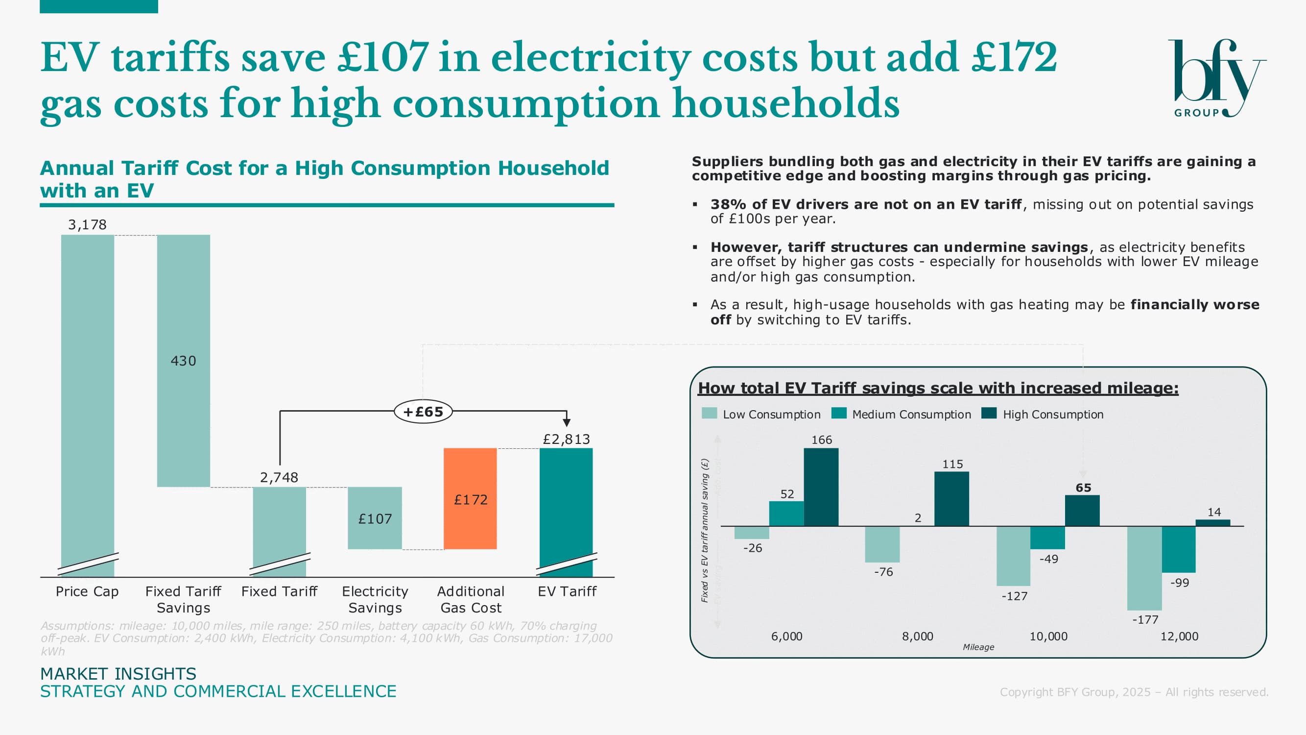 A recent market study found 38% of EV drivers aren't using EV-specific tariffs, missing out on advertised savings of "up to £400 annually." Yet these claims are often misleading. Drivers with low mileage or high gas usage may see no benefit at all. In fact, our modelling shows that high-consumption households, with gas heating and annual mileage of 10,000, could end up paying around £65 more on average compared to a standard fixed tariff. The real-world economics are far more complex than marketing suggests.