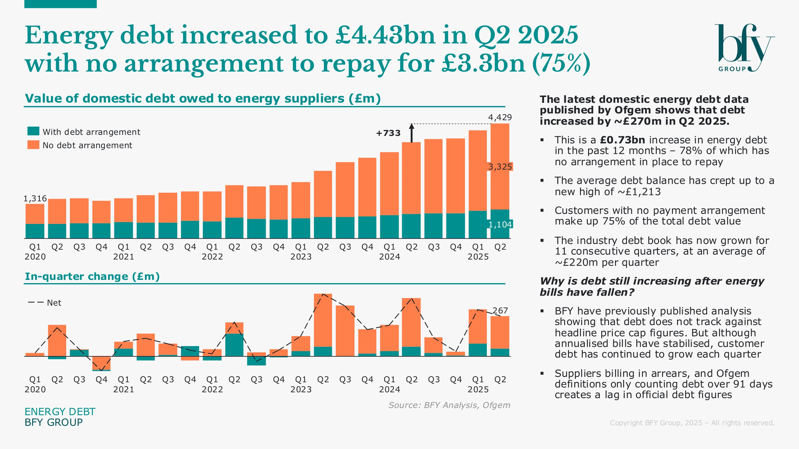 Domestic energy debt has climbed to a record £4.43bn in Q2 2025, an increase of £0.73bn compared to Q2 last year.