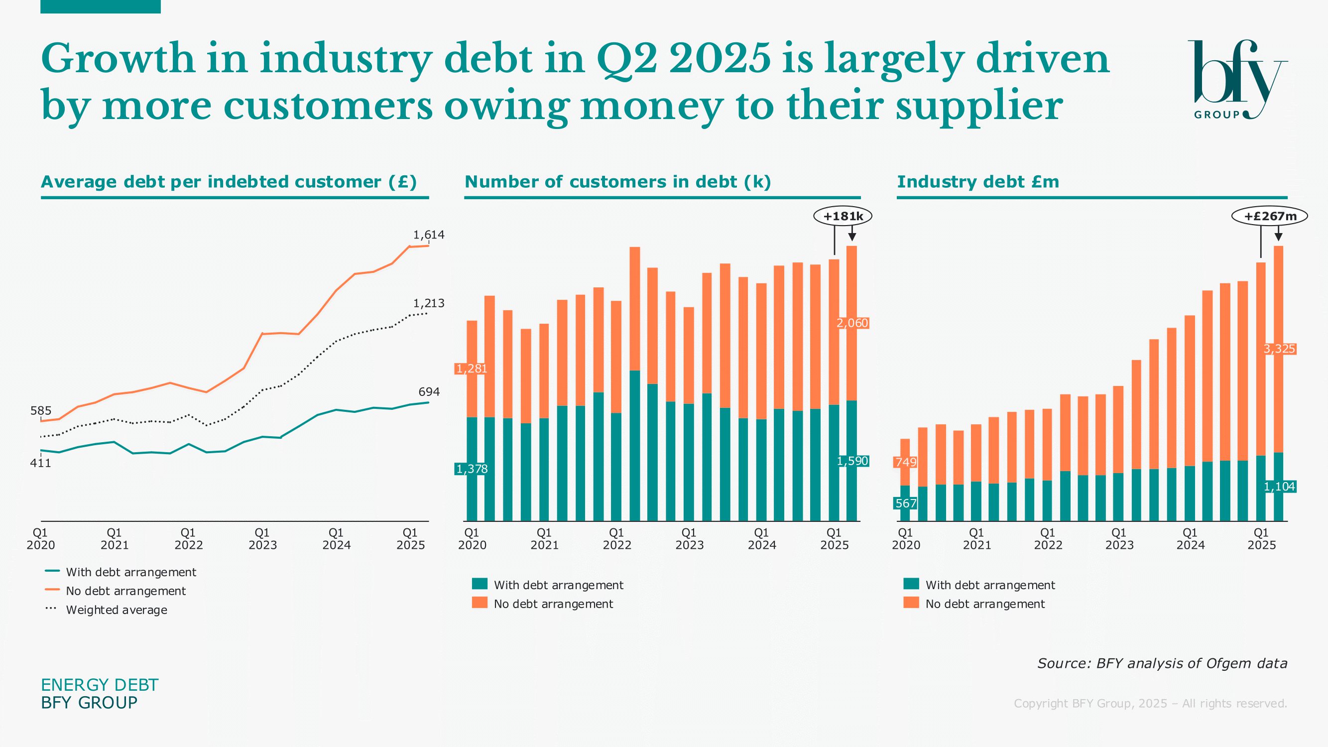 In Q2 2025, the number of customers in debt grew by 181k, reaching a total of 2.06m. This has pushed industry debt to £4.43bn, despite only a small increase in the average debt per household, which rose slightly to £1,213.