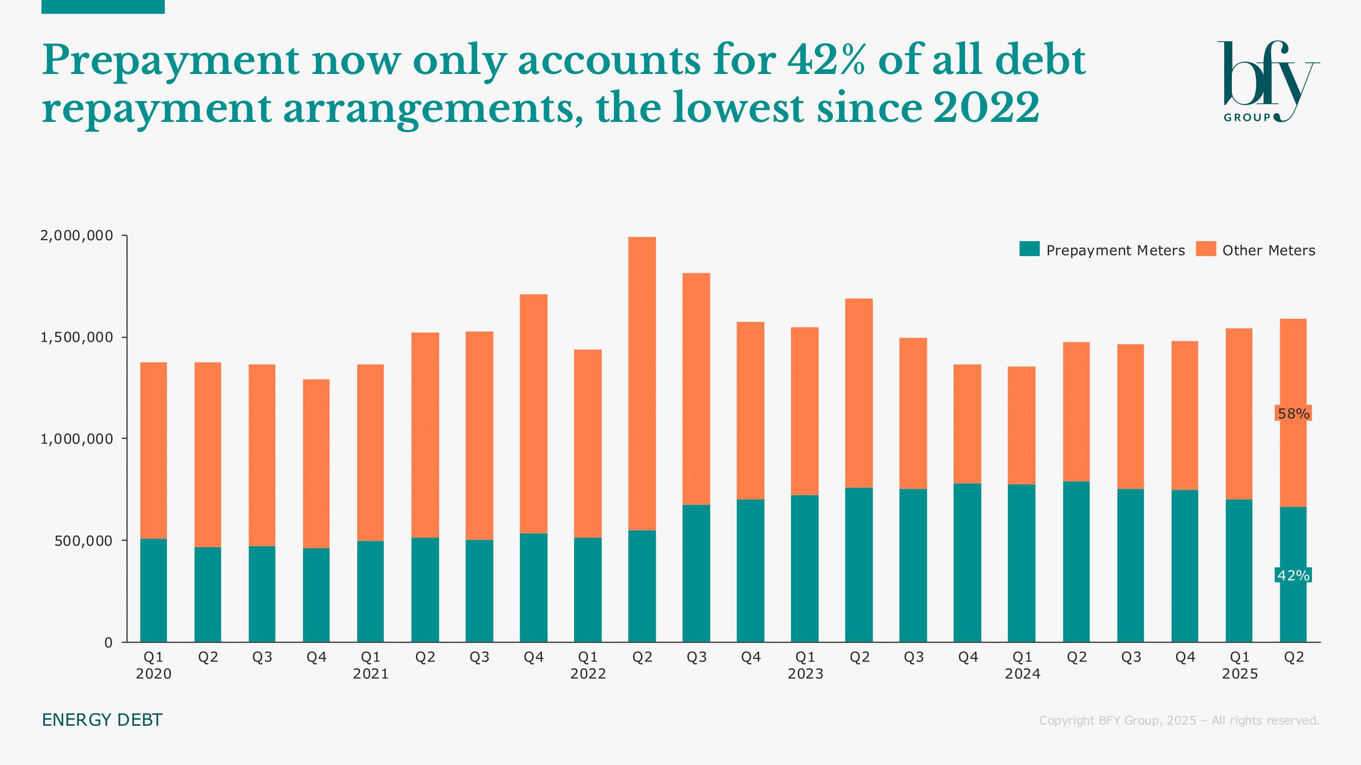 - Prepayment meters now account for just 42% of repayment arrangements, the lowest proportion since 2022
