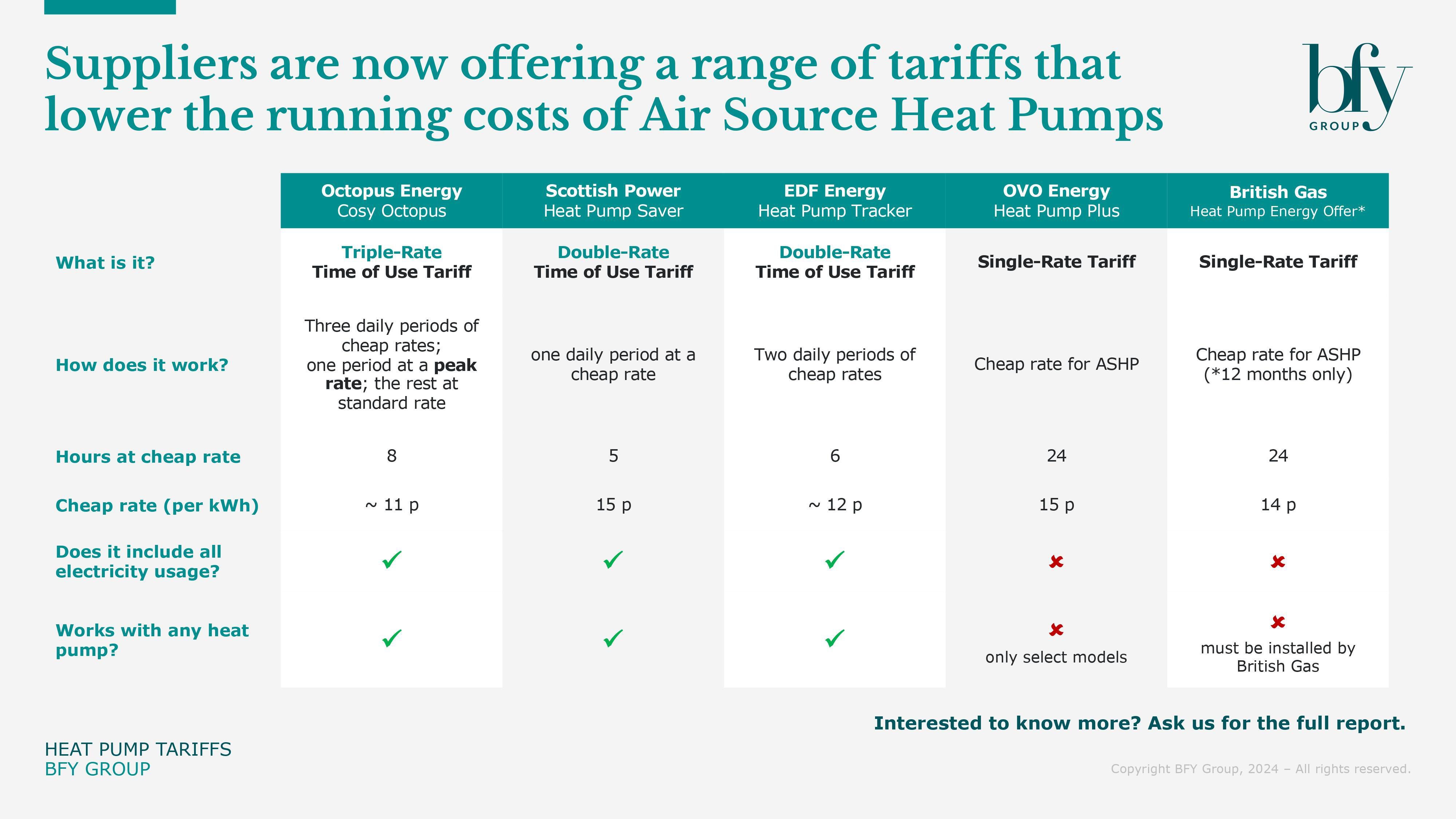 All major suppliers now offer renewable products such as air source heat pumps (ASHPs), solar panels, and batteries. British Gas is leveraging existing infrastructure to enable ASHP installation and servicing, whilst others like OVO Energy are forming partnerships with specialised companies like HeatGeek. Octopus have gone a step further, developing an in-house heat pump with a corresponding tariff to optimise usage, showcasing their commitment to net zero and this revenue stream.