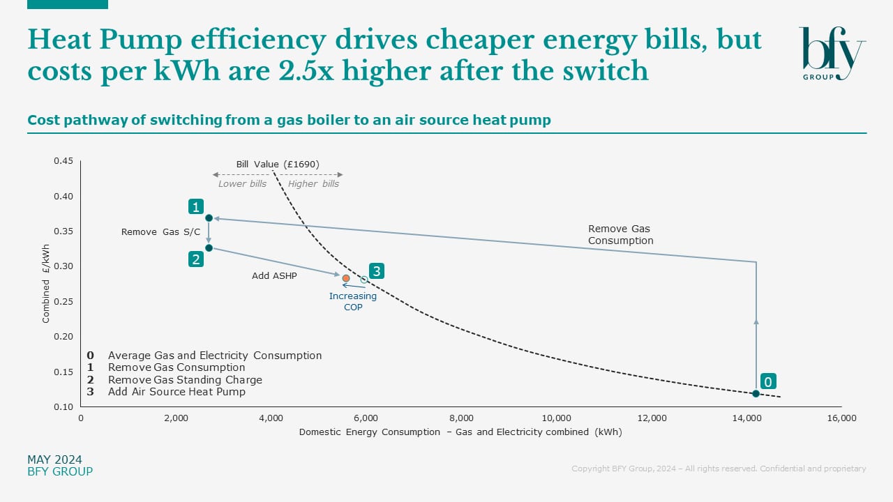 - A customer replacing a gas boiler with an ASHP pays more per kWh - but uses much less energy.