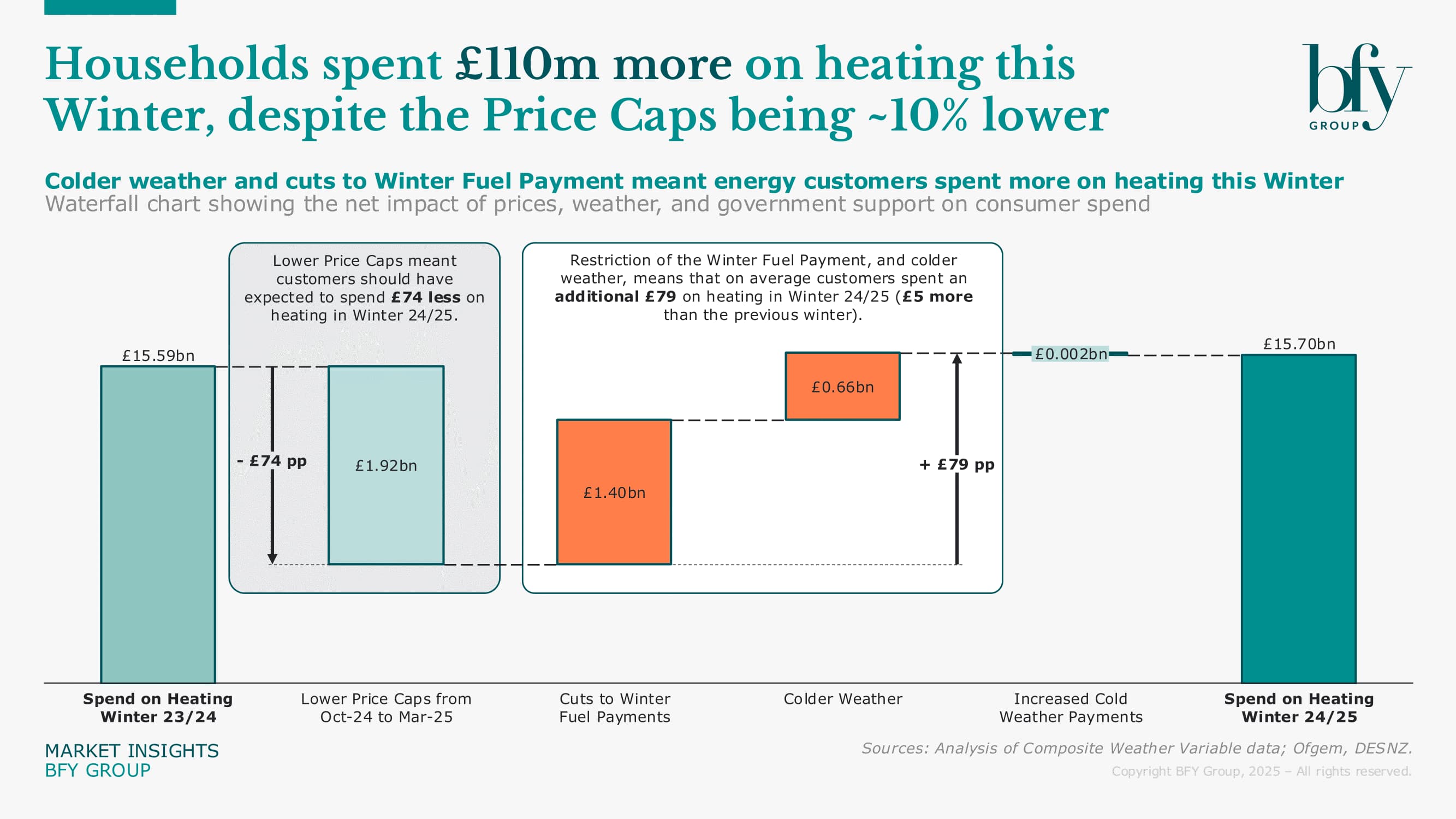 - Restriction of the Winter Fuel Payment, and colder weather, means that on average customers spent an additional £79 on heating in Winter 24/25 (£5 more than the previous winter).