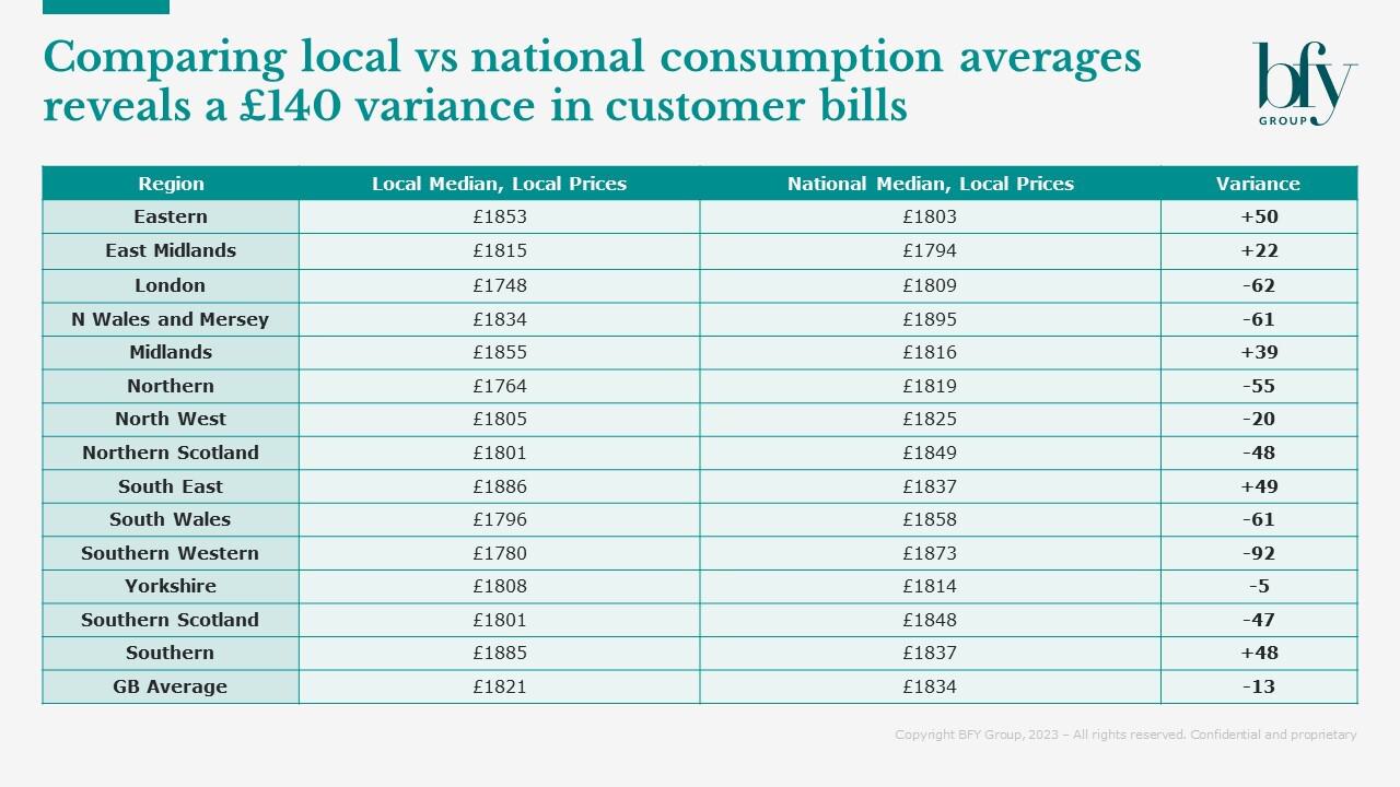 Split by distribution region, the table below shows the difference between bills based on the national median of consumption (used in the Price Cap), and bills based on the local median.