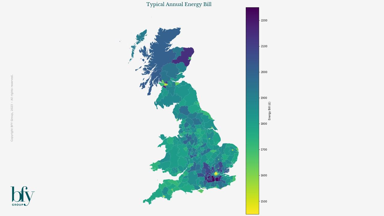 Consumption levels, and subsequently the amount spent on energy, varies significantly across the country, with the largest gap from actual bills to the Price Cap being ~£500 (in the outskirts of London, Glasgow and Aberdeenshire).