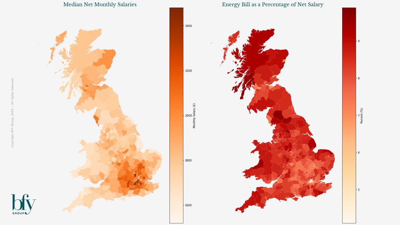 Our final analysis show a direct correspondence between energy bills and median salary. Using the latest available earnings data (2023) published by the ONS, we can see that the areas with the largest energy bills are those with typically the highest net salaries.