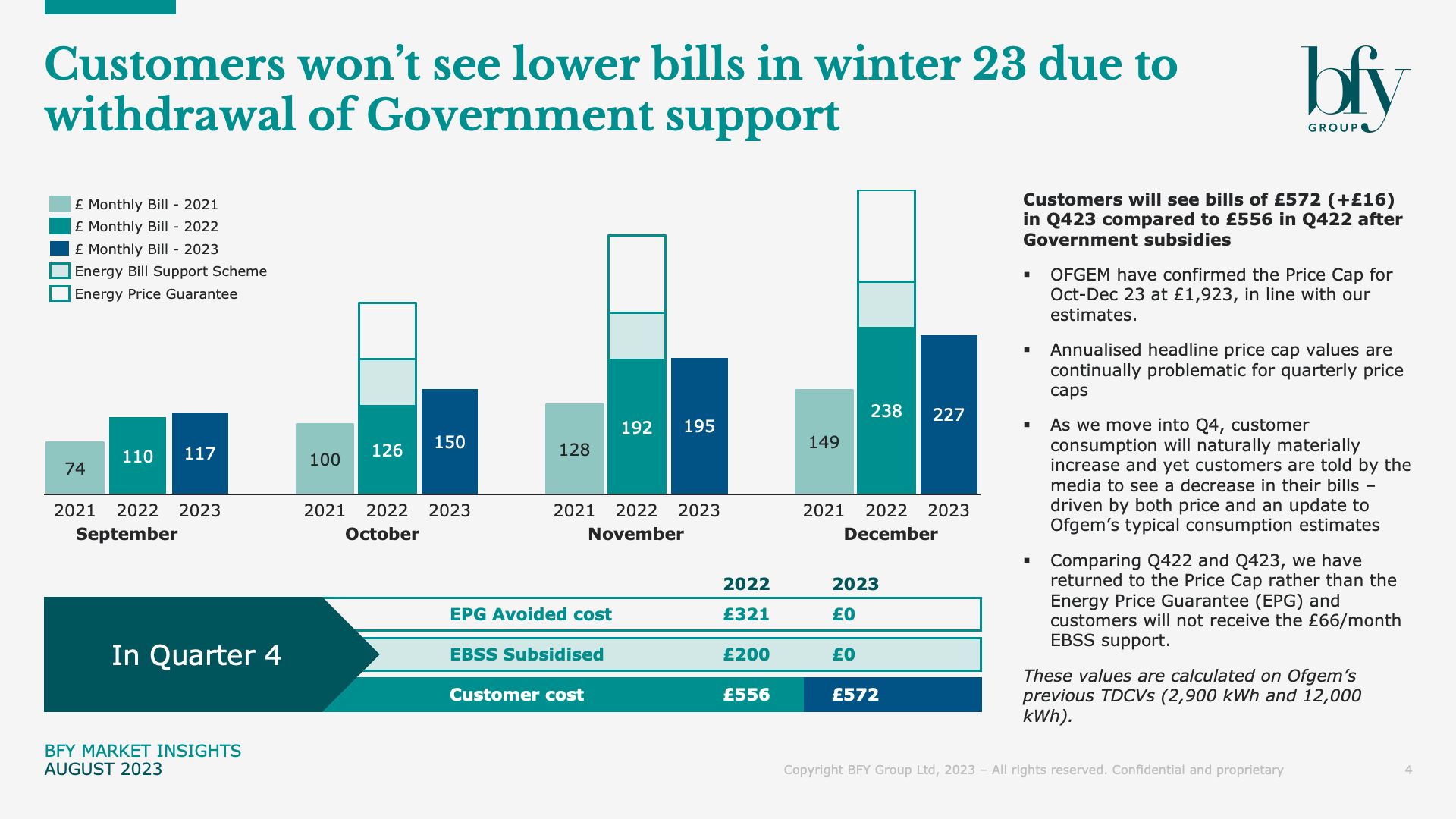 Ofgem have announced the Price Cap for Oct-Dec 23 at £1,923 in line with BFY Group projections. Although this represents a decrease for the second consecutive quarter, we’re expecting to see customer bills moving in the opposite direction this winter, due to the removal of government support.