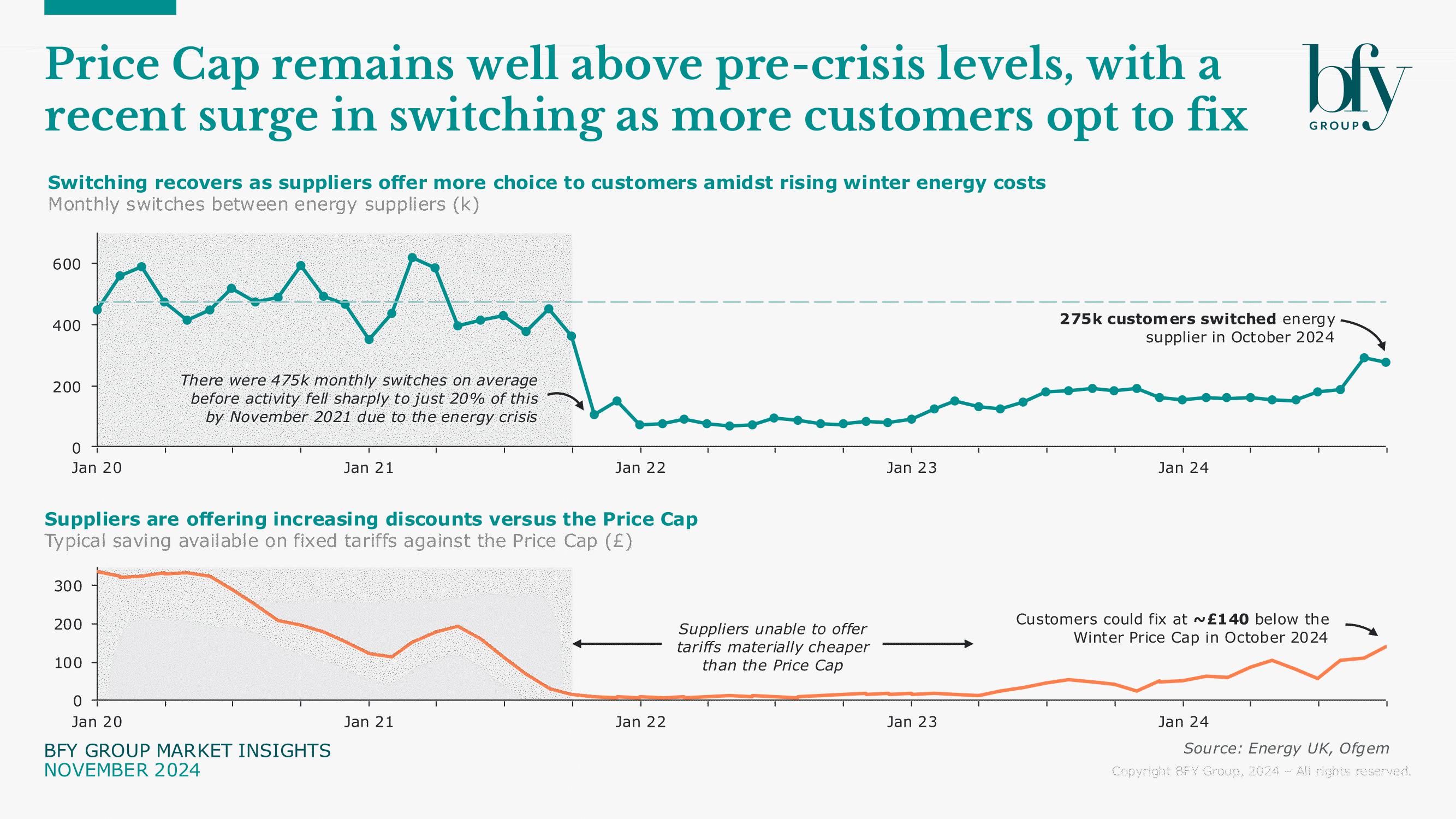 Switching activity has seen a notable uplift since September, with ~280k domestic customers switching per month. This is driven by customers locking in cheaper fixed tariffs before the Price Cap increase, with annual savings of up to £140 available against the cap.