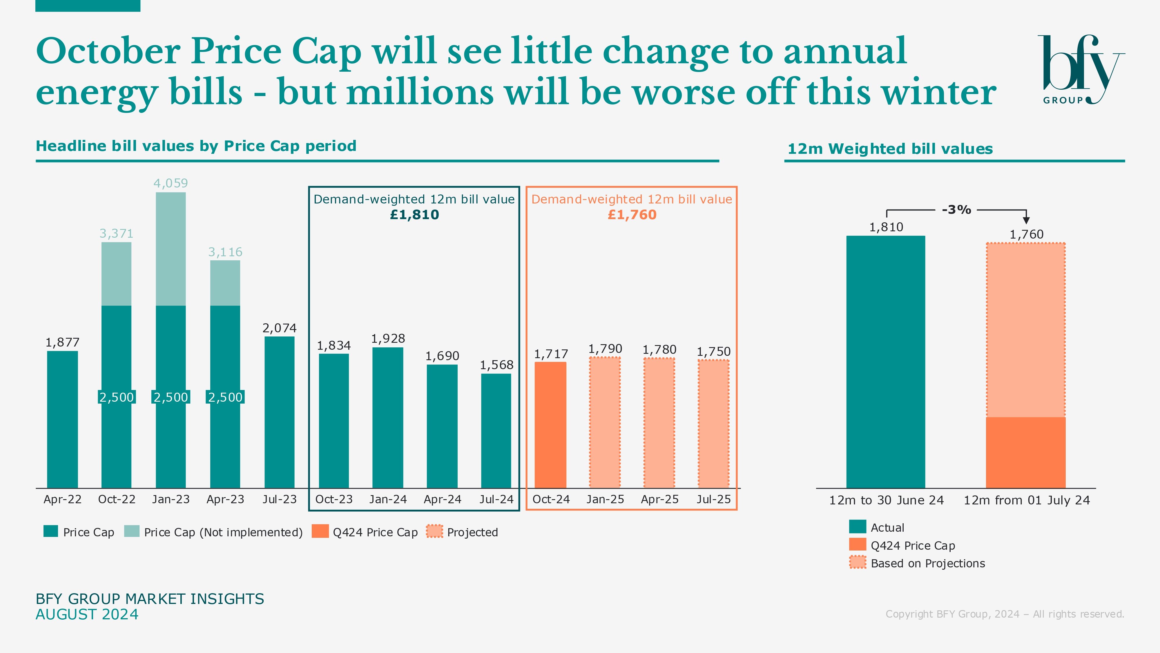 Current wholesale prices suggest we could see further Price Cap increases in 2025, rising to ~£1790 in Q1-25. However, when adjusting average 12 month bills to reflect seasonal consumption, annual customer spending looks set to remain stable, which brings positives for customers and suppliers.