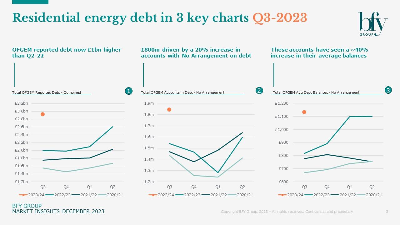 Total Ofgem reported debt is now at ~£3bn for Q3-2023, 50% (~£1bn) higher than Q3-2022.
