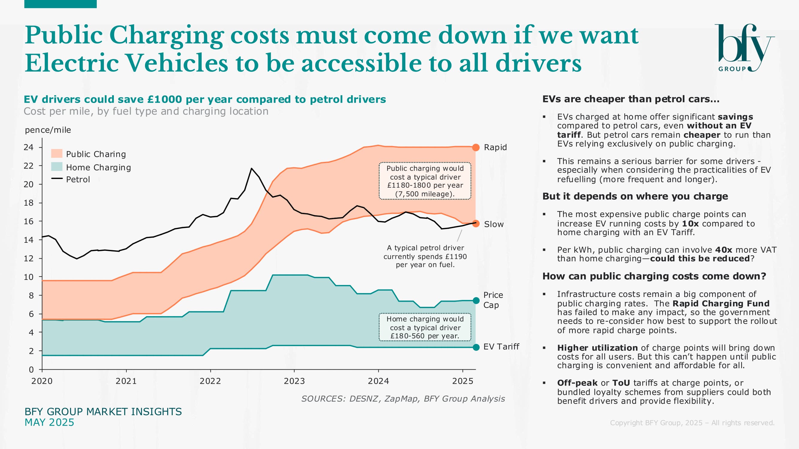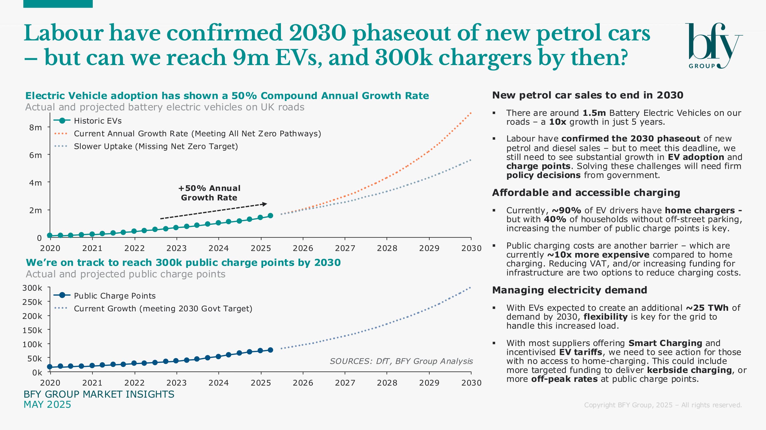 For the UK to meet its 2030 goals, firm policy decisions are needed to support rapid growth in both EV adoption and public charging points. Labour's confirmation of the 2030 phaseout adds urgency – but this should be matched with coordinated support.