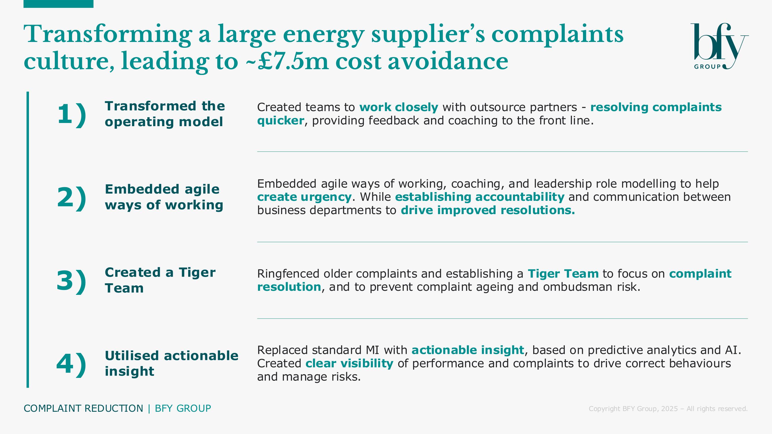 Within the 5-month period, we helped to transform our client’s complaints operation, releasing some of the external pressures they were facing, while realising ~£7.5m in cost avoidance.