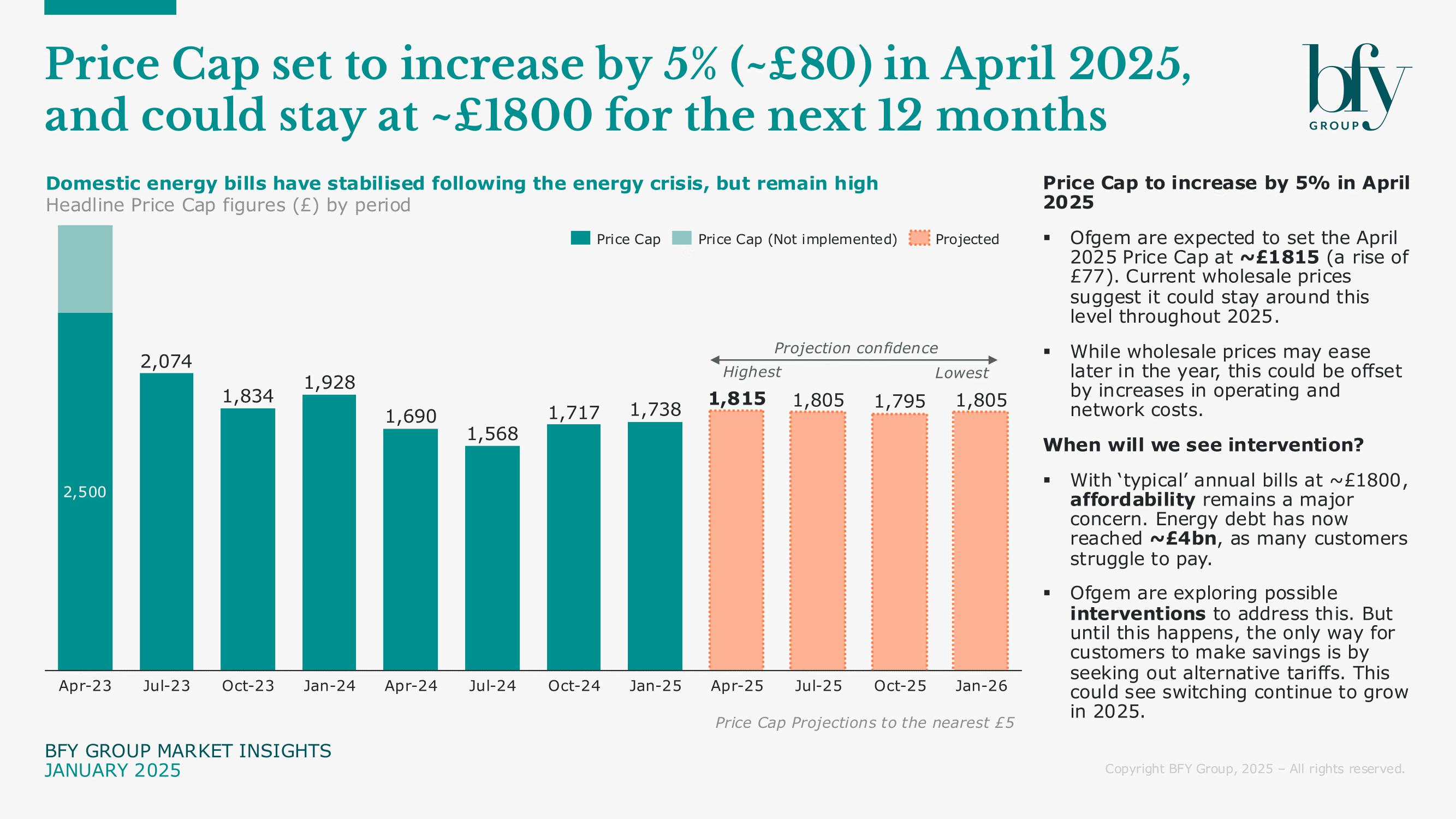 Ofgem's Energy Price Cap is set to increase by 5% (~£80) in April 2025 to ~£1,815, and could stay at around ~£1,800 for the next 12 months, based on the latest BFY Group projection.