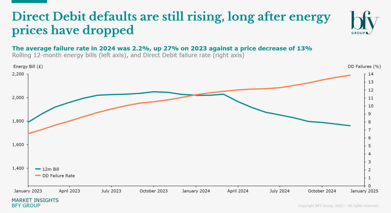 BFY analysis suggests that the rise in DD failures can be traced back to the suspension of payment adequacy checks during the pandemic. In 2020, many suppliers paused DD reviews to ease financial pressure, unintentionally locking customers into payments that were too low to cover their actual energy consumption.