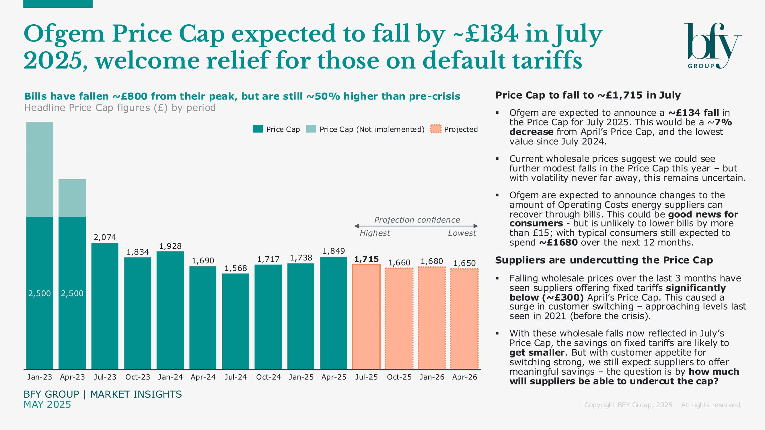 Ofgem's Price Cap expected to fall by ~£134 (7%) in July to ~£1,715 - the lowest level in a year, and welcome relief for customers on default tariffs.